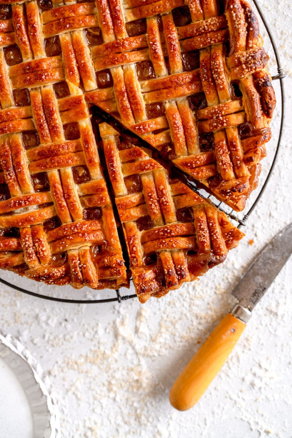 - When you are ready to bake the pie, brush the top well with egg wash, and sprinkle with turbinado sugar. Place on a baking sheet and place on the lower rack, and bake for 20 minutes, until the pastry is turning golden brown and looks set. Then, reduce the oven temperature to 375°f / 190°c, move the baking sheet with the crostata on it to the middle rack, and bake for a further 40 to 50 minutes, until the pastry is deep golden brown and the filling is bubbling. Tent the top with foil at any time if you are worried it is browning too quickly. It is important you get a good bake on a fruit pie. If you don't you run the risk of a soggy bottom, so make sure it is very well baked.