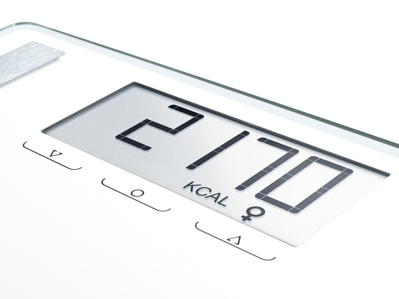 - Calculates body fat, water content, muscle mass, daily calorie requirement (kcal)