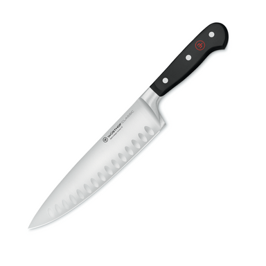 A cook's knife with a scalloped edge to prevent thin or soft slices from sticking to the blade. A kitchen essential for slicing, mincing, dicing ...