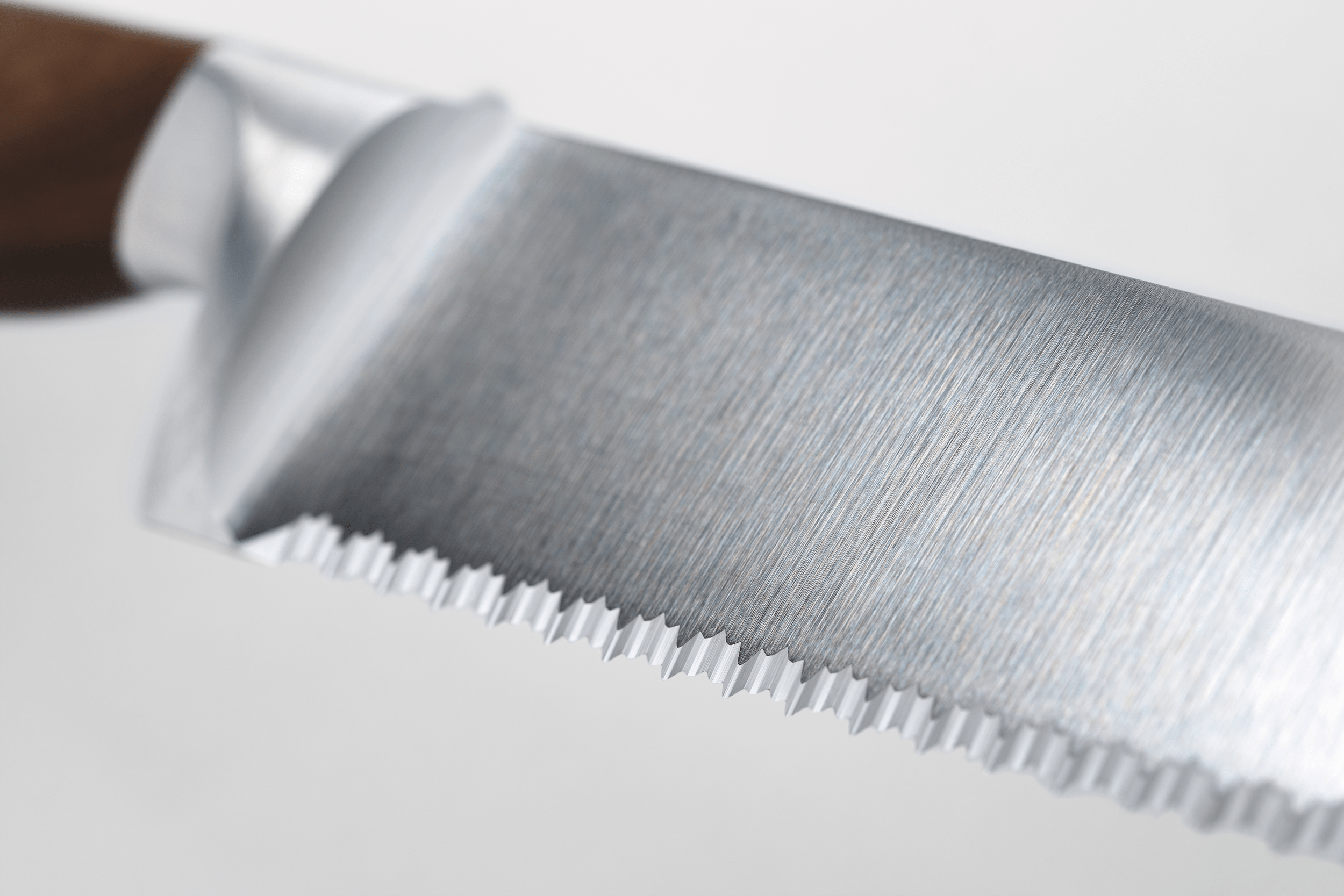 WÜSTHOF’s precise, double-serrated edge makes a clear difference with this bread knife: in contrast with a single-serrated edge, this knife has serrations within the serrations, meaning that it remains sharp for longer, requires less pressure and is suitable for very precise, smooth cuts. Bread with a hard crust is not crushed when sliced with this double-serrated blade, while bread with a soft crust is also sliced cleanly, without any tearing of the delicate surface.