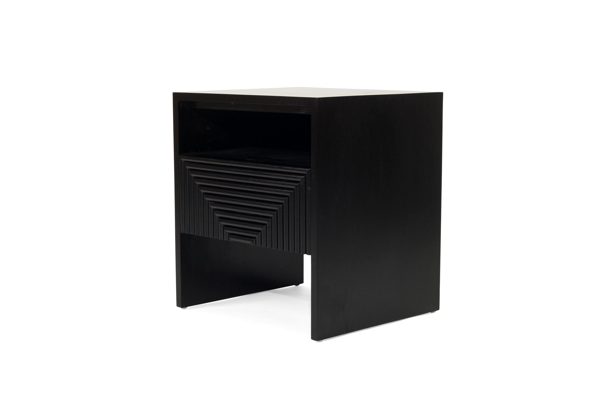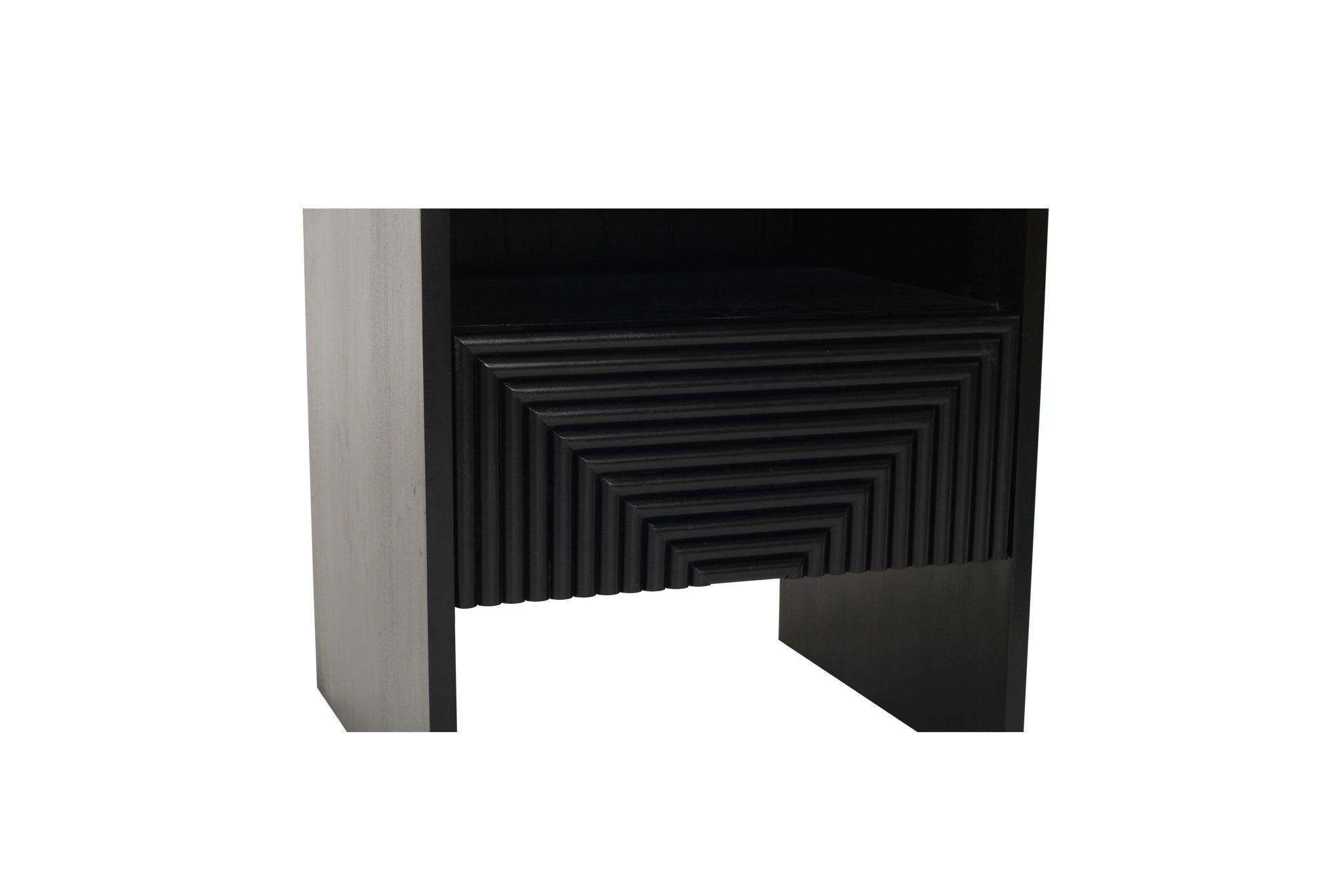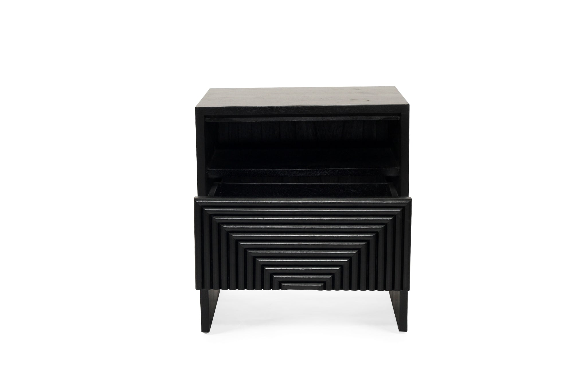 The Cessnock Bedside Table is constructed from Acacia Wood and is finished in black. It has 1 opening drawer..