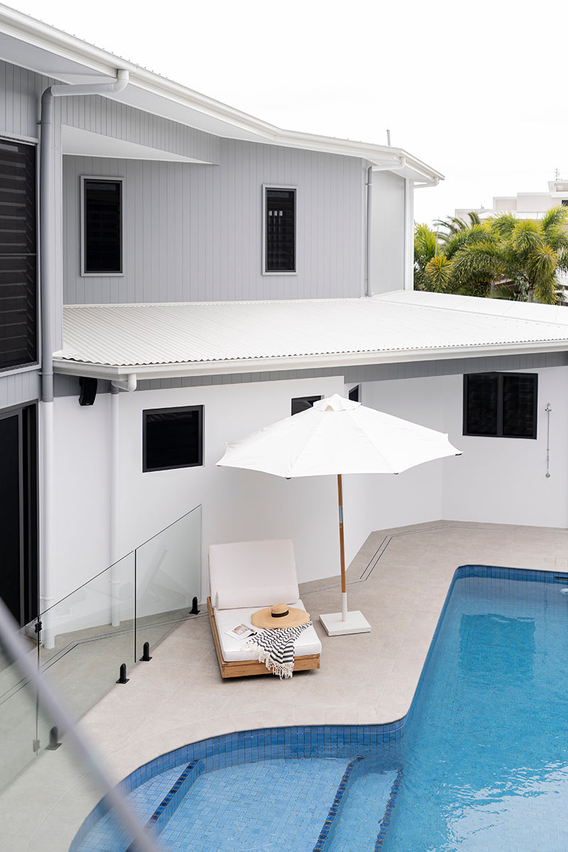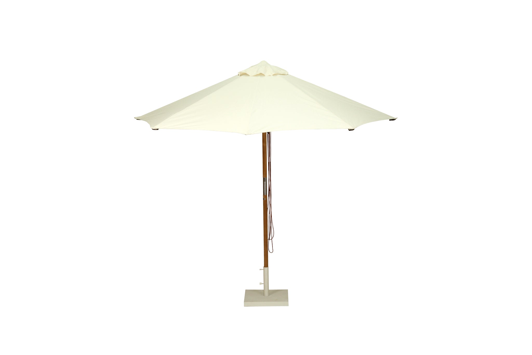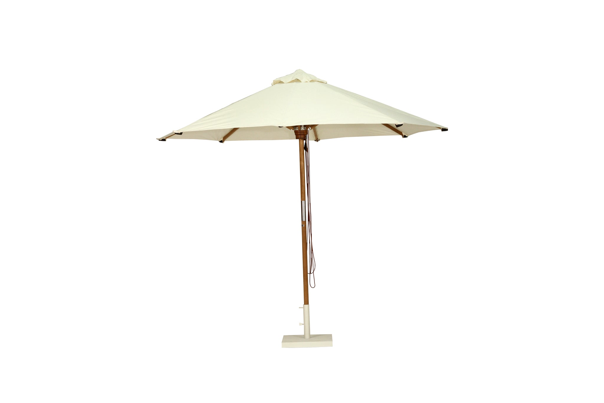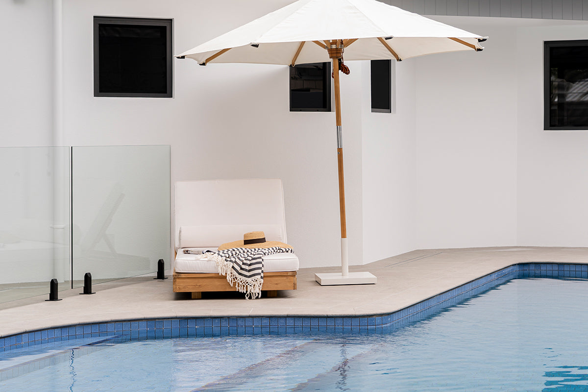 The Outdoor Parasol is built for the harsh elements of the Australian landscape and provides a stable and sturdy shield from heavy rain and UV rays. It features a high grade teak pole and frame, marine grade stainless steel fittings, marine grade rope and a durable round shaped shade made from sunproof copacobana that is specifically designed for outdoor and marine conditions. It is made from a material mix of PVC and standard acrylic yarn creating both a matte and shiny look that filters light and allows water to pass through. Designed to be used on outdoor awnings and curtains as well as numerous marine applications including all sorts of boat tops, covers, and cushions. Your Outdoor Parasol will stay vibrant and fresh for a long, long time.