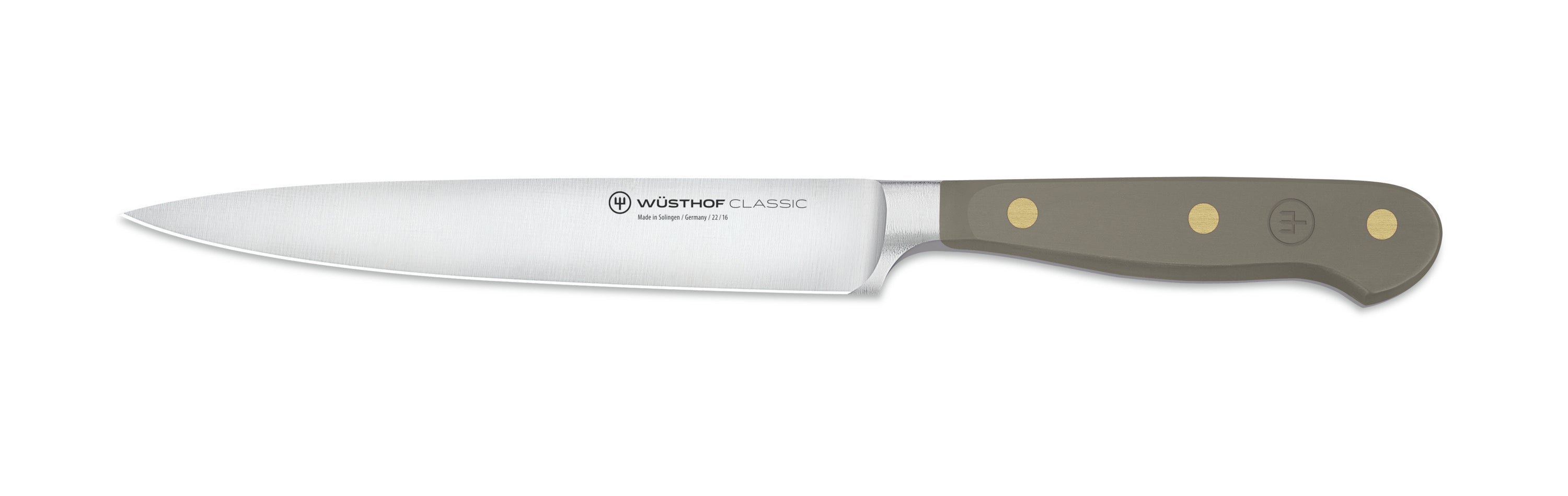 Introducing the Wusthof Classic Colour Velvet Oyster Utility Knife - the perfect blend of form and function. This stunning knife is part of the Classic Colour range and is a great addition to any kitchen or knife kit, adding personality and style with its vibrant velvet oyster colour.