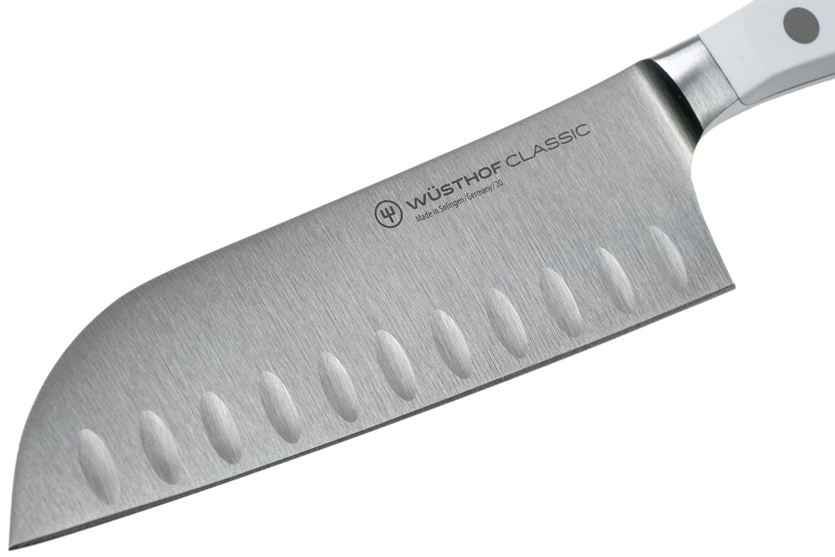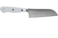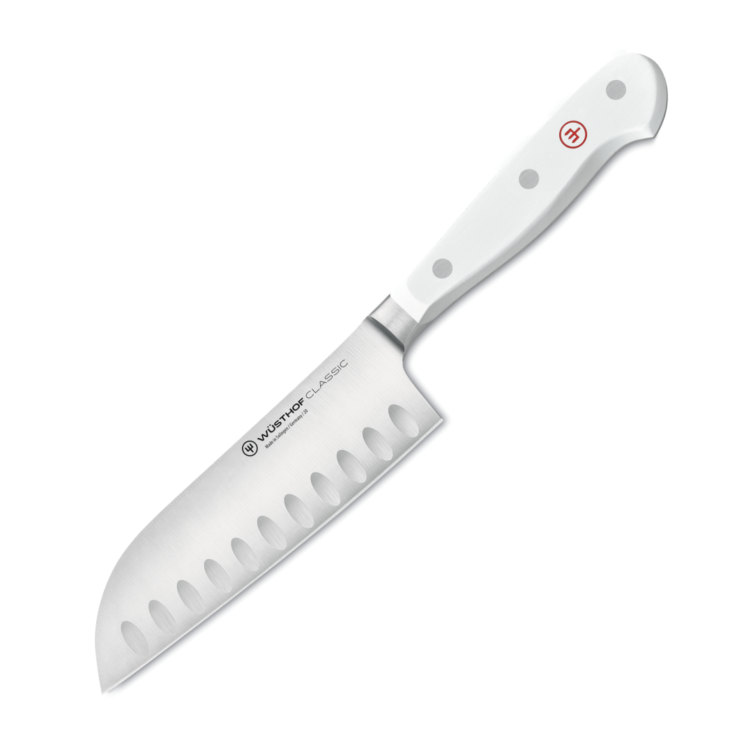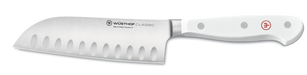 This Wüsthof Classic White santoku knife with dimples 14 cm is perfect for the finer cutting tasks. Specifically developed to prepare Sushi and Sashimi but can do so much more. Finely cutting herbs or vegetables will, for instance, also be a piece of cake. Because the blade is enhanced with dimples little air bubbles emerge. This prevents the food from sticking to the blade.