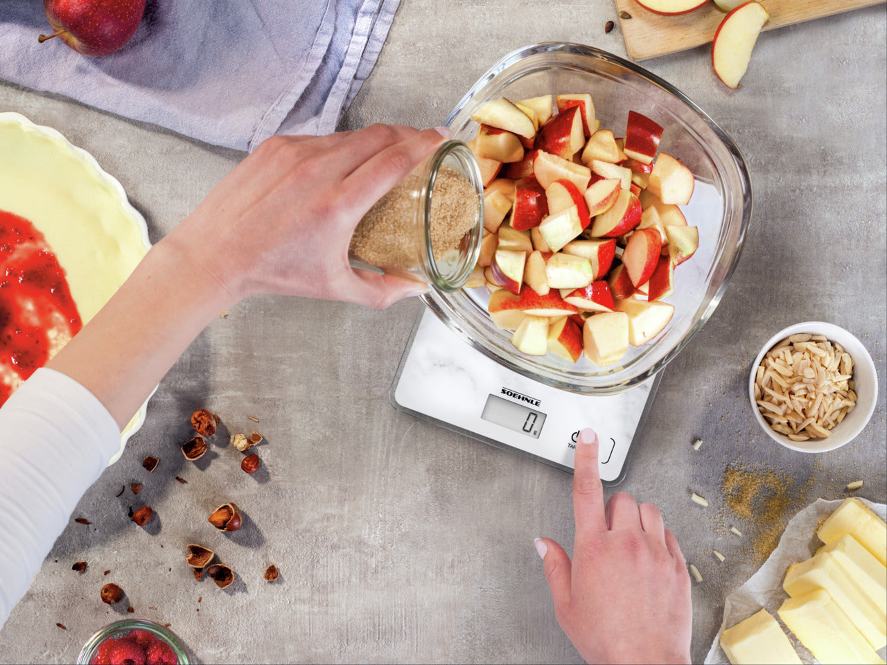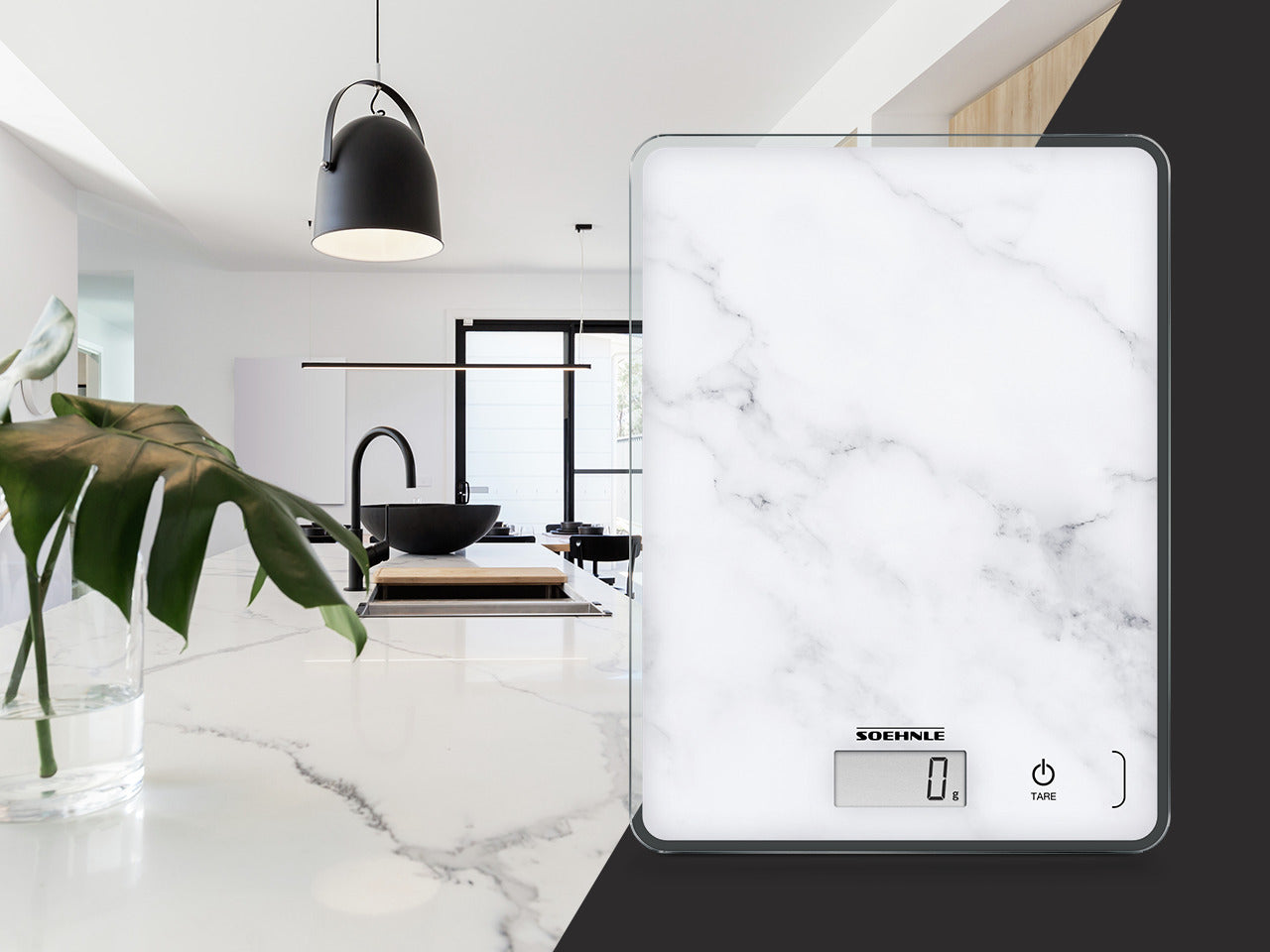 With its high weighing capacity of 5 kg and 1 g increment precision, the Soehnle Page Compact 300 Marble digital kitchen scale is suitable for everyday use. Its modern design makes it a special gem in your kitchen. The natural marble look evokes a stylish presence. Thanks to its chic appearance you can keep the kitchen scale on your surface or hang it on the wall – it will blend beautifully into the room. The 12 mm LCD display is very practical, making the digits easy to read. The scale is easy to use with the Soehnle patented sensor touch. Unlike the versions with keys, the model does not have any buttons which could gather dirt. This makes it easy to clean. Naturally, the household scale is fitted with an automatic switch-off function and therefore making the scale very energy efficient. The tare weighing function allows ingredients to be weighed conveniently in one bowl when baking and cooking. The Page Compact 300 Marble digital kitchen scale is provided with anti-slip feet so it will remain stable on its surface when in use The extra-slim, compact design means it can be stored away in a space-saving way or hung on the wall. Batteries are included so your digital scale is ready for use immediately. These will last for over two years if you use the scale twice a day. The battery compartment is childproof, secured firmly with screws.