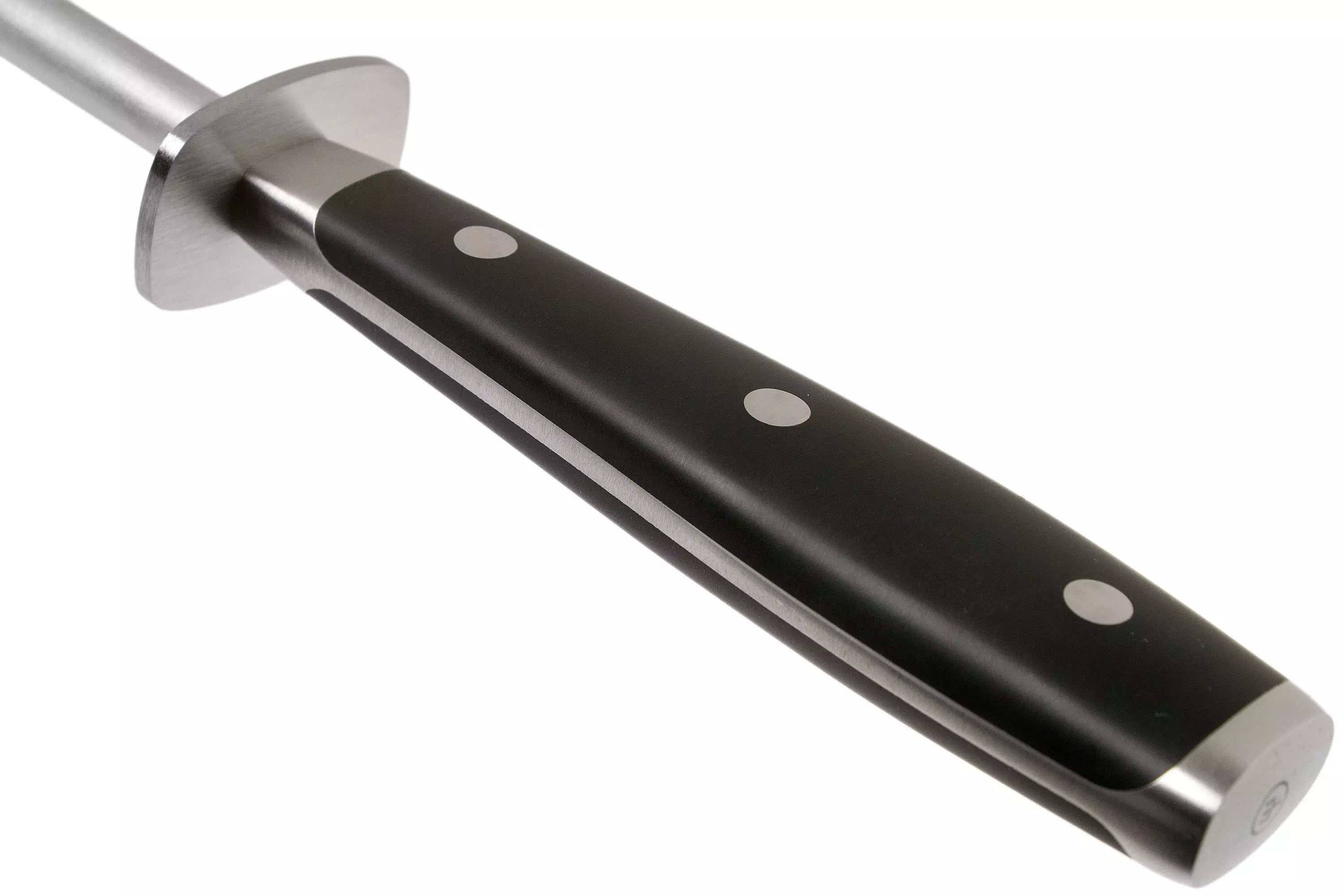 This Wüsthof Classic Ikon Black honing steel with a length of 26 cm is made from one piece of stainless steel. The steel is attached to the plastic handle with three rivets.