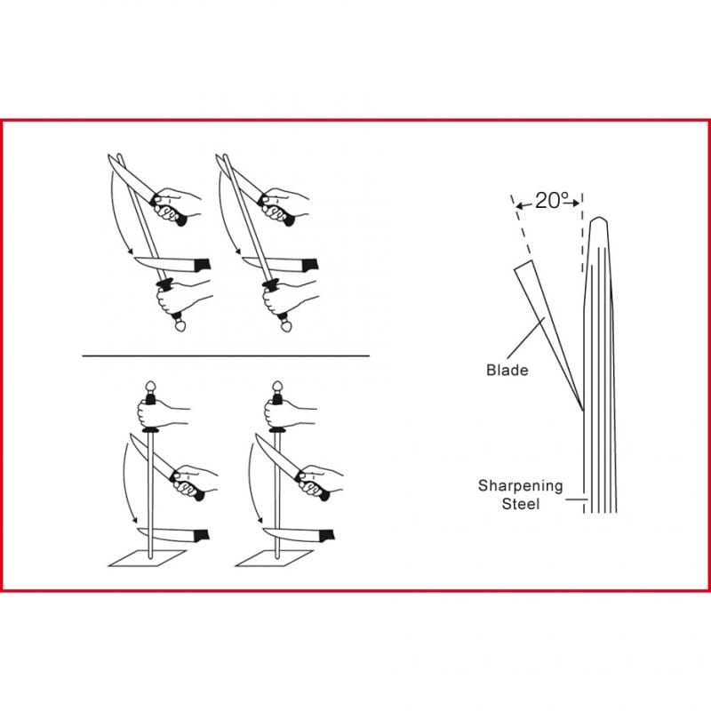 You use a honing steel to make a knife that is already in a good shape, a little sharper. You move your knife over it before you use it. A honing steel does not remove material, but ensures that the microscopic metal particles are neatly realigned again. You basically straighten out the burr that emerges as you use your knives on a regular basis. This is also the main difference between a honing steel and sharpening steel. A sharpening steel does remove particles.